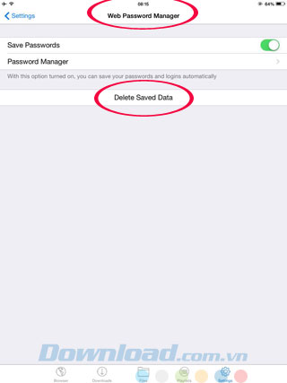 Trong mục Web Password Manager, người dùng có thể bật hoặc tắt tính năng lưu mật khẩu bằng cách kéo công tắc cuối cùng. Khi bật chức năng này (công tắc màu xanh), bạn có thể lưu mật khẩu và thông tin đăng nhập tự động. Trình quản lý mật khẩu Password Manager (chỉ xuất hiện khi bạn bật chức năng lưu mật khẩu bên trên) gồm danh sách mật khẩu đã lưu trong trình duyệt tích hợp của Free Video Downloader Plus Plus. Bạn có thể nhấn chọn Delete Saved Data để xóa toàn bộ dữ liệu đã lưu, gồm mật khẩu và thông tin đăng nhập.