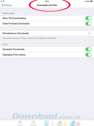 Chuyển sang mục Downloads and Files để bật hoặc tắt loạt tùy chọn như Allow 3G Downloading - cho phép tải video bằng kết nối 3G, Clear Finished Downloads - xóa toàn bộ các file video đã tải về máy, Simultaneous Dowloads để chọn số lượng thread tải cùng thời điểm, bạn có thể chọn từ 1 đến 10 thread. Mục Files với 2 tùy chọn: Generate Thumbnails để tạo thumbnail cho video tải về và Capitalize First Letters để viết hoa chữ cái đầu của tên file. Các tùy chọn này đều được bật mặc định.