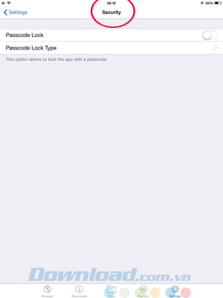 Phần Security (bảo mật) cho phép người dùng kích hoạt chế độ khóa ứng dụng bằng kiểu mã khóa. Tính năng này bị tắt mặc định. Các kiểu khóa ứng dụng Free Video Downloader Plus Plus bao gồm sử dụng mã PIN hay nối chấm.