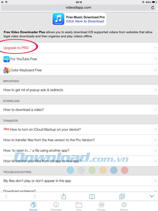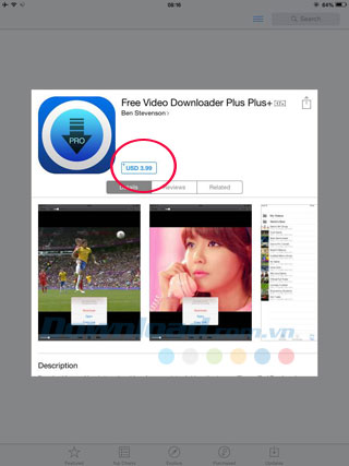 Khi nhấn nút Update to Pro trên trang Settings, bạn sẽ được chuyển ngay tới cửa hàng ứng dụng App Store với phiên bản Free Video Download Plus Plus Pro có mức giá $3.99. Bạn có thể mua bản Pro để trải nghiệm trọn vẹn tính năng ứng dụng và không bị quảng cáo làm phiền.