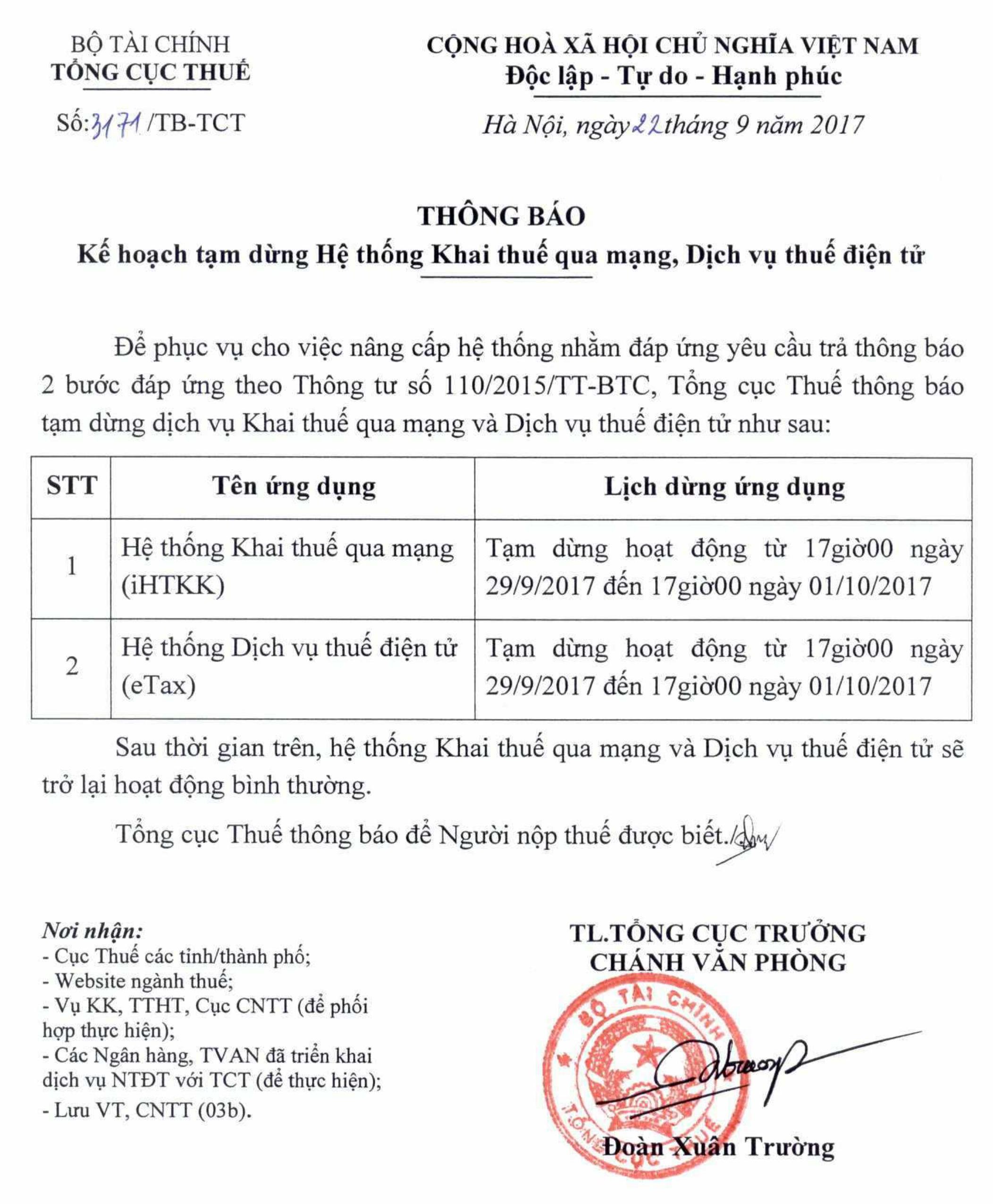 Tìm hiểu thêm »Ngày 22/9/2017, Tổng cục Thuế ban hành Thông báo 3171/TB-TCT về việc tạm dừng hệ thống khai thuế qua mạng, dịch vụ thuế điện tử. Cụ thể, sẽ tạm dừng hoạt động kể từ 17h00 ngày 29/9/2017 đến 17h00 ngày 01/10/2017 đối với hệ thống khai thuế qua mạng (iHTKK) và Hệ thống dịch vụ thuế điện tử (eTax). Nội dung chi tiết, mời các bạn cùng tham khảo tại đây.