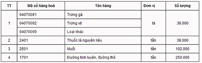 1. Thương nhân được phân giao hạn ngạch thuế quan nhập khẩu muối, đường, thuốc lá nguyên liệu và trứng gia cầm theo quy định tại Thông tư số 04/2006/TT-BTM ngày 6 tháng 4 năm 2006 của Bộ Thương mại (nay là Bộ Công Thương) hướng dẫn một số nội dung quy định tại Nghị định số 12/2006/NĐ-CP ngày 23 tháng 01 năm 2006 của Chính phủ quy định chi tiết thi hành Luật Thương mại về hoạt động mua bán hàng hóa quốc tế và các hoạt động đại lý mua, bán, gia công và quá cảnh hàng hóa với nước ngoài.