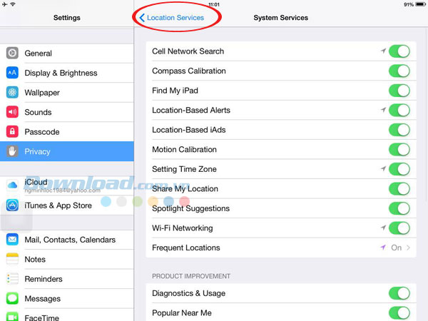 Truy cập Settings > Privacy > Location Services > System Services > tắt các tùy chọn như Diagnostics & Usage, Location-Based iAds, Popular Near Me và Setting Time Zone.