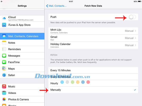Chế độ Email đẩy (Push Email) cũng là nhân tố góp phần làm pin sụt giảm. Hãy cài đặt mọi tài khoản Email ở chế độ cập nhật thủ công thay vì check tự động hoặc đẩy.