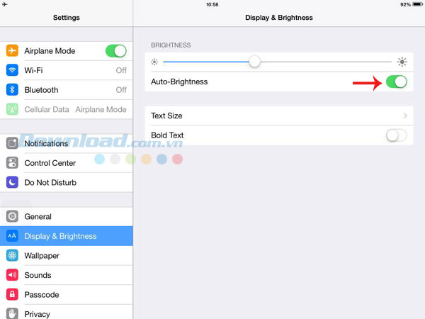 Truy cập Settings > Display & Brightness (hoặc Brightness & Wallpaper trên iOS 7) > di chuyển thanh trượt Auto Brightness sang On (màu xanh).