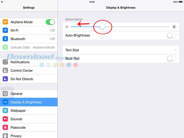 Điều chỉnh độ sáng mặc định của màn hình iPhone/iPad bằng thanh trượt này. Màn hình càng tối thì càng tiết kiệm pin. Truy cập Settings > Display & Brightness (hoặc Brightness & Wallpaper trên iOS 7) > di chuyển thanh trượt tùy ý.