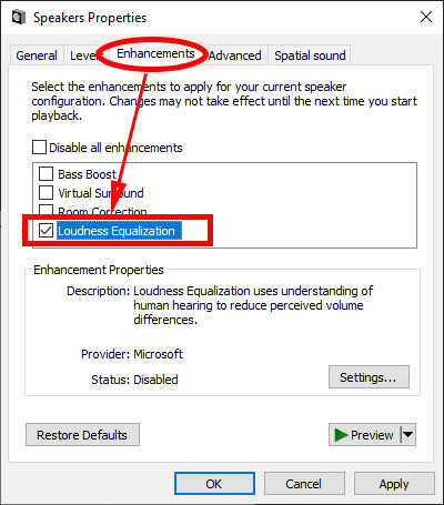 Ở cửa sổ hiện ra, chọn tab Enhancements sau đó tích chọn vào Loudness Equalization. Tùy chọn này sẽ khuếch đại âm thanh phát ra từ loa lên mức tối đa. Chọn xong các bạn nhấn OK để lưu lại.
