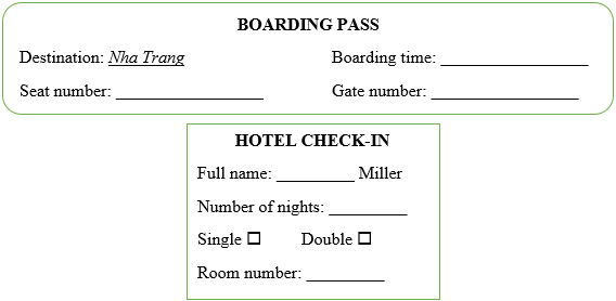 (Hỏi bạn bên cạnh các câu hỏi để điền thông tin du lịch của bạn đó. Đối với một số câu hỏi, bạn có thể tự nghĩ ra thông tin.)