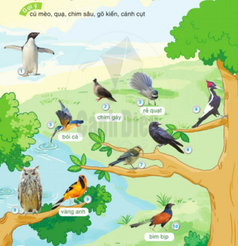 Tên những loài chim có trong ảnh: chim cánh cụt, chim gáy, chim rẻ quạt, chim gõ kiến, chim bói cá, chim sâu, quạ, chim cú mèo, chim vàng anh và chim bìm bịp.