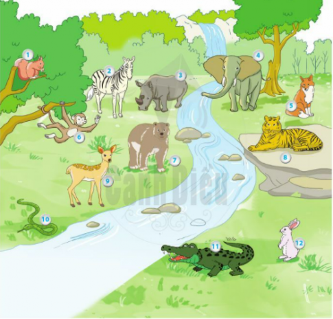 Tên các con vật có trong tranh là: con sóc, ngựa vằn, tê giác, voi, con cáo, con khỉ, con gấu, con hổ, con nai, con rắn, cá sấu và thỏ.