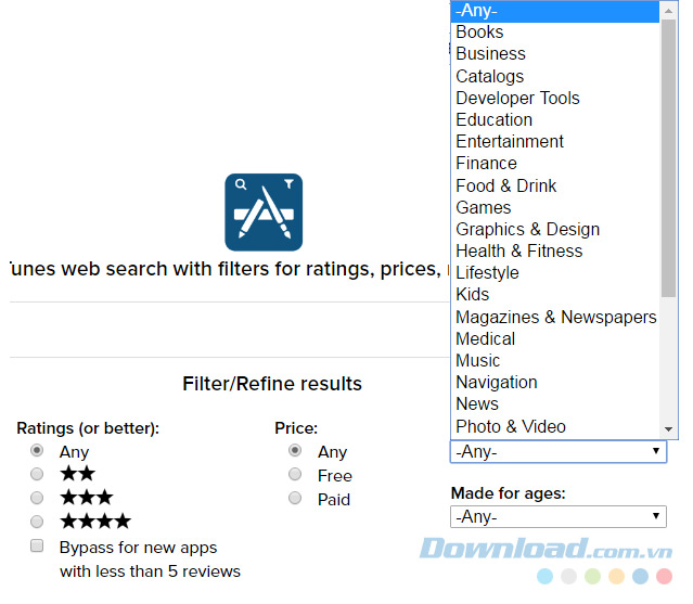 Chọn sử dụng bộ lọc khi tìm kiếm ứng dụng