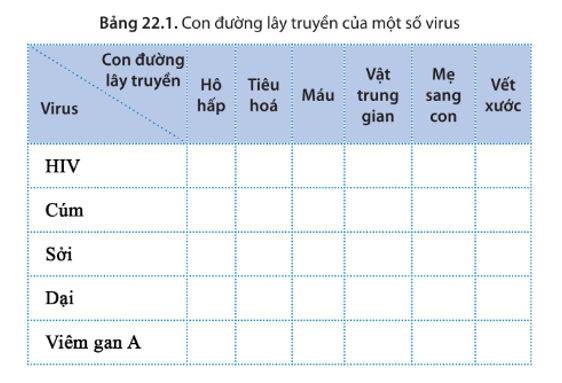 Hãy cho biết con đường lây truyền của virus HIV, cúm, sởi, dại, viêm gan A theo gợi ý trong bảng 22.1.
