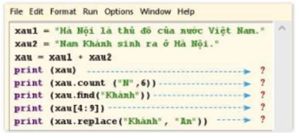 Hãy dự đoán kết quả đưa ra màn hình sau mỗi câu lênh xuất dữ liệu print() trong chương trình ở hình bên và sau đó dùng cửa sổ Shell để đối chiếu, kiểm tra kết quả dự đoán.