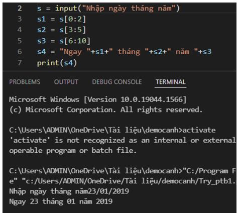 Em hãy viết chương trình nhập từ bàn phím xâu s ghi ngày tháng dạng dd/mm/yyyy, trong đó dd là hai kí tự chỉ ngày, mm là hai kí tự chỉ tháng, yyyy là bốn kí tự chỉ năm. Sau đó đưa ra màn hình ngày, tháng, năm dưới dạng xâu “Ngày dd tháng mm năm yyyy”.