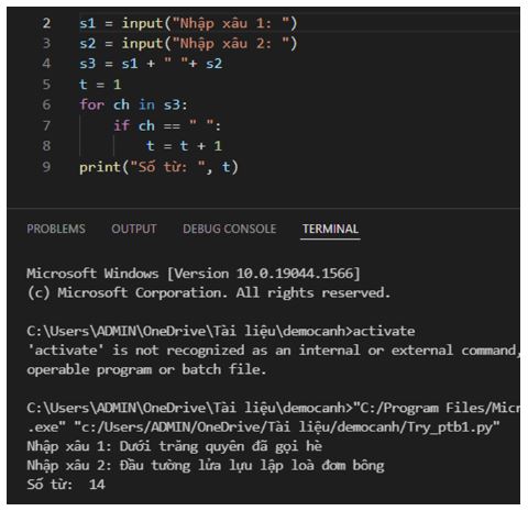 Nhập vào từ bàn phím hai xâu s1 và s2, mỗi xâu không chứa kí tự dấu cách ở đầu và cuối xâu cũng như không chứa hai hay nhiều dầu cách liên tiếp nhau. Nếu xâu không chứa dấu cách thì nó là một từ, trong trường hợp ngược lại, dấu cách là dấu phân tách các từ trong xâu. Ví dụ, xâu “Bước tới Đèo Ngang, bóng xế tà” chứa bảy từ. Em hãy viết chương trình xác định và đưa ra màn hình tổng số từ trong hai xâu s1 và s2 đã cho.