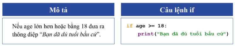 Bảng sau đây cho một ví dụ về viết câu lệnh if tương ứng với mô tả điều kiện để đưa ra một thông báo trên màn hình. Trong bảng biến age là biến số nguyên chứa giá trị tuổi của một người. Em hãy cho thêm hai ví dụ nữa tương tự như ví dụ đã có trong bảng.