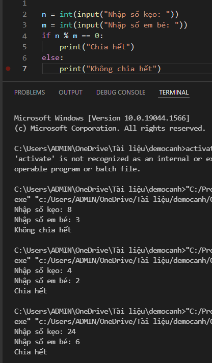 Có n chiếc kẹo và m em bé. Hãy viết chương trình nhập vào hai số nguyên dương n, m và kiểm tra n chiếc kẹo có chia đều được cho m em bé hay không.