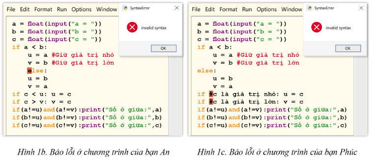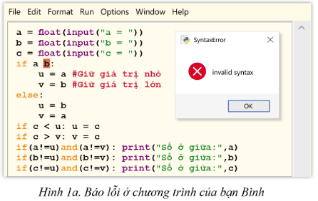 Mỗi bạn soạn thảo chương trình và chạy thử trên máy tính của mình, những mỗi bạn đều gặp báo lỗi của Python (Hình 1a, Hình 1b, Hình 1c). Em hãy xác định lỗi ở chương trình của mỗi bạn, sửa lỗi cho từng bạn sao cho chương trình chạy được và đưa ra kết quả đúng.