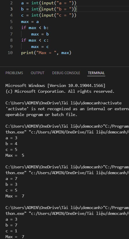 Viết chương trình nhập từ bàn phím ba số nguyên, mỗi số ghi trên một dòng và đưa ra màn hình giá trị lớn nhất trong các số đã nhập. Em hãy chạy chương trình với một số bộ dữ liệu khác nhau.