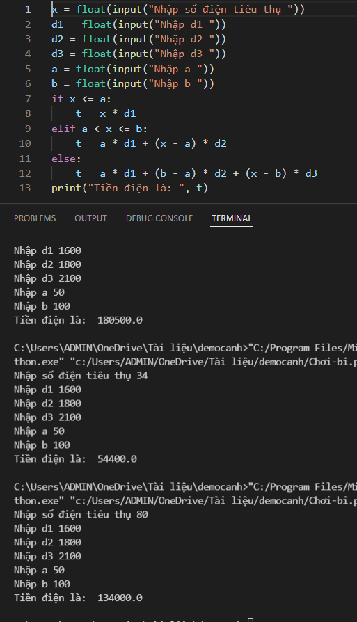 Trong tháng người dùng tiêu thụ x(kWh) điện. Nếu x ≤ a thì số tiền phải trả là x × d1 , nếu a < x ≤ b thì số tiền phải trả là , nếu x > b thì số tiền phải trả là  . Em hãy viết chương trình nhập vào từ bàn phím các số nguyên dương a, b, d1, d2, d3 và x, tính và đưa ra màn hình số tiền điện phải trả. Tìm hiểu bảng giá điện hiện hành và chạy chương trình một số lần sao cho có đủ các bộ dữ liệu đầu vào đại diện cho các mức tính tiền điện.