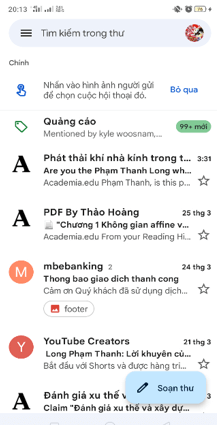 + Màn hình hiện các tin nhắn của Gmail, những tin nhắn đang in đậm là tin nhắn chưa được đọc. Nếu muốn đọc chỉ cần ấn vào email đó.