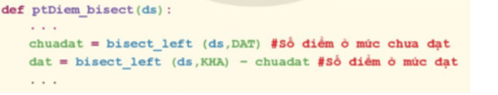 - Dãy số đã sắp thứ tự tăng dần (không giảm) nên có thể dùng hàm bisect left (trong mô đun bisect) tìm được các vị trí phân chia dãy điểm thành 4 đoạn điểm: Chưa đạt, Đạt, Khá và Tốt. Từ đó tính được số lượng điểm theo từng mức xếp hạng.