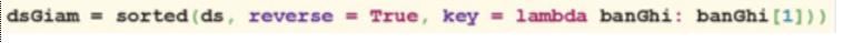 - Python có sẵn phương thức sort, hàm sorted với tham biến key = lambda để sắp xếp danh sách các cặp hay các bộ nhiều thành phần, theo giá trị của một thành phần bất kì trong bộ. Cách gọi sử dụng để sắp xếp danh sách các cặp (tên, điểm) theo thứ tự điểm giảm dần theo mẫu tham khảo Hình 2: