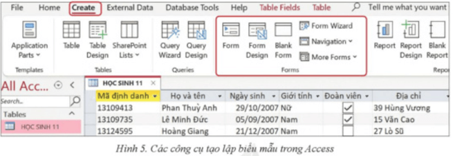 Bước 2. Nháy chuột chọn vào Create để xuất hiện các công cụ tạo lập, trong đó có các công cụ tạo lập biểu mẫu (Hình 5)