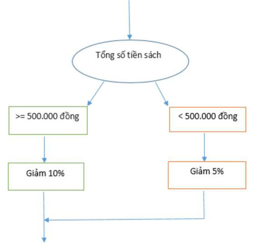 1. Tính Tổng số tiền sách khi chưa tính giảm giá) , gọi số đó là Tổng số tiền sách2. Nếu Tổng số tiền sách >= 500.000 đồng; số tiền được giảm là 10% của Tổng số tiền sách 3. Nếu Tổng số tiền sách < 500.000 đồng; số tiền được giảm là 5% của Tổng số tiền sách