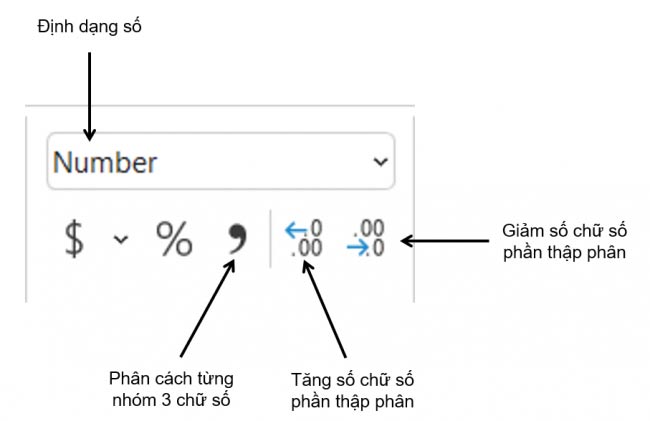 Các lệnh trong nhóm lệnh Number để thao tác nhanh chọn một định dạng số và tác dụng của các lệnh đó là:
