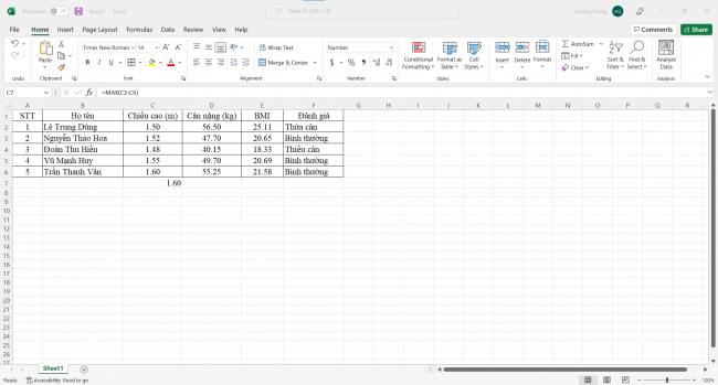 Bước 3: Ta có được kết quả số đo chiều cao lớn nhất là 1.60m của bạn Trần Thanh Vân.