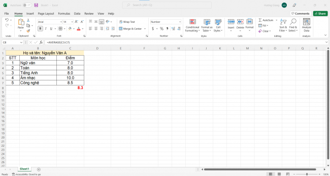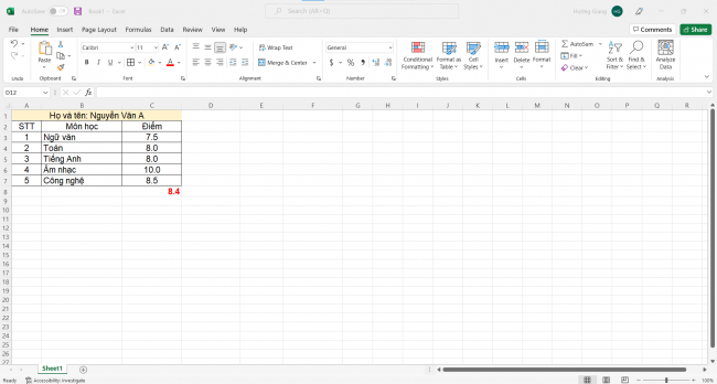 Khi giáo viên nhập điểm các môn của một bạn học sinh vào và tính điểm trung bình như hình sau đây: