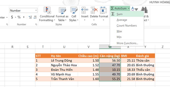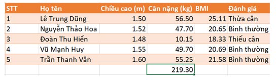 Kết quả xuất hiện dưới cột Cân nặng là kết quả tổng của cột cân nặng.