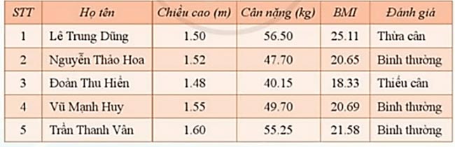 Trong bảng chỉ số BMI có được ở mục Thực hành, hãy tìm số đo chiều cao lớn nhất, trung bình chỉ số BMI và điền thêm vào bảng.