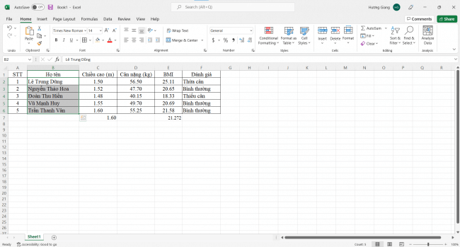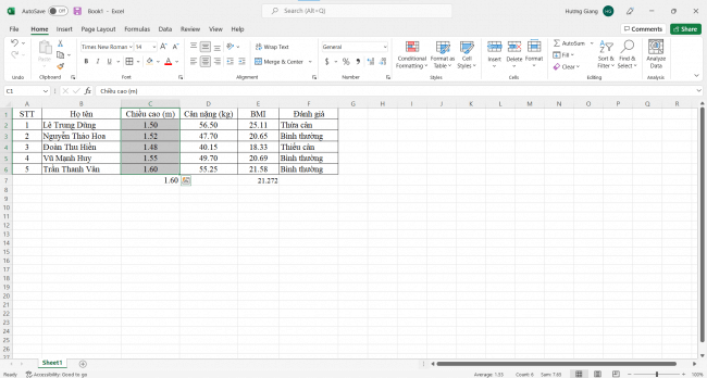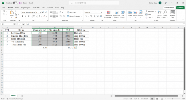 b. Chọn khối ô chứa các ô số liệu trong "Bảng chỉ số BMI của một nhóm": Trên thanh trạng thái xuất hiện các thông tin về khối ô đó: Count: 15; Average: 24.22, Sum: 363.31.