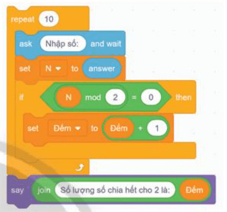 3) Lặp 10 lần - Nhập một số từ bàn phím. - Nếu là số chia hết cho 2 thì Đếm = Đếm + 1 - Thông báo số lượng số chia hết cho 2. |