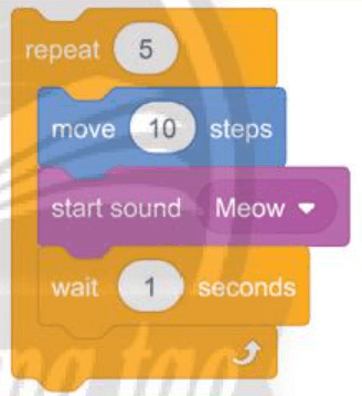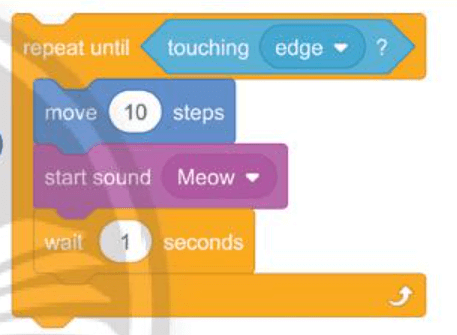 2) Lặp lại cho đến khi chú mèo chạm vào cạnh của sân khấu. - Chú mèo di chuyển 10 bước và kêu "meo". - Hiển thị kết quả trong 1 giây. |