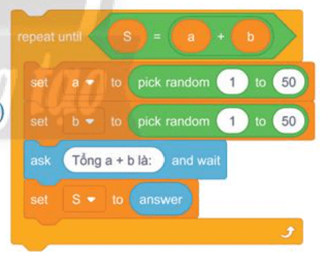 3) Lặp lại cho đến khi người dùng nhập đúng tổng hai số a và b (a, b là hai số nguyên dương bất kì trong khoảng từ 1 đến 50). - Biến a nhận giá trị ngẫu nhiên từ 1 đến 50. - Biến b nhận giá trị ngẫu nhiên từ 1 đến 50. - Người dùng nhập kết quả tổng a + b từ bàn phím. |