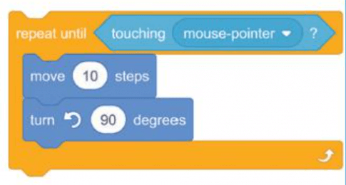 1) Lặp cho đến khi chạm vào con trỏ chuột - Di chuyển 10 bước. - Xoay nhân vật 90 o ngược chiều kim đồng hồ. |