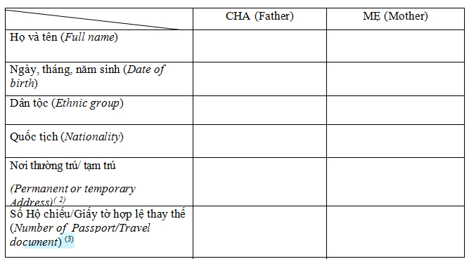 Đề nghị (I hereby request) (1)............................................................. đăng ký khai sinh cho người có tên dưới đây (birth registration for the child with the following information):