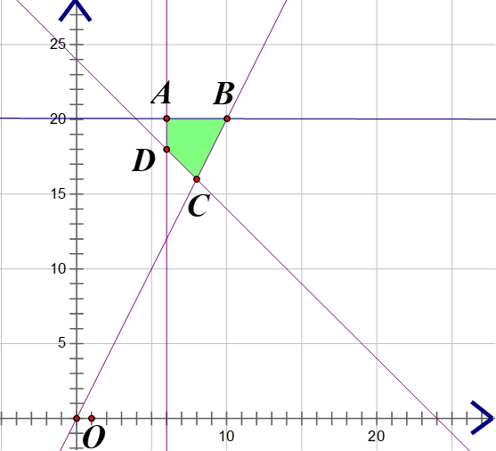 \(\left\{ \begin{array}{l}x \ge 6\\x + y \ge 24\\\left( {x + y} \right) - x \le 20\\y \ge 2x\end{array} \right.\)