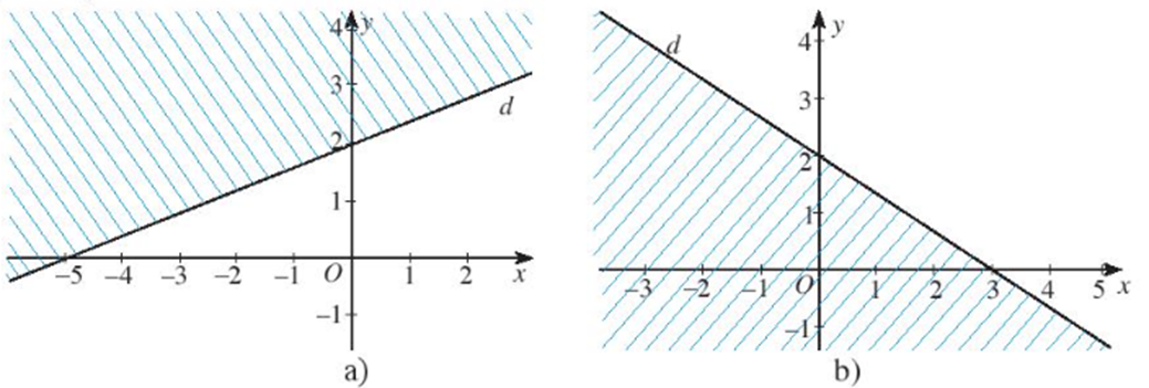 Miền không gạch chéo (không kể bờ d) trong mỗi hình dưới đây là miền nghiệm của bất phương trình nào?