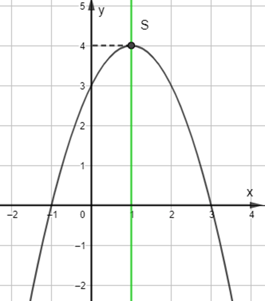 + Có đỉnh S với hoành độ: {x_S} = \frac{{ - b}}{{2a}} = \frac{{ - 2}}{{2.( - 1)}} = 1;{y_S} = - {1^2} + 2.1 + 3 = 4.\({x_S} = \frac{{ - b}}{{2a}} = \frac{{ - 2}}{{2.( - 1)}} = 1;{y_S} = - {1^2} + 2.1 + 3 = 4.\)