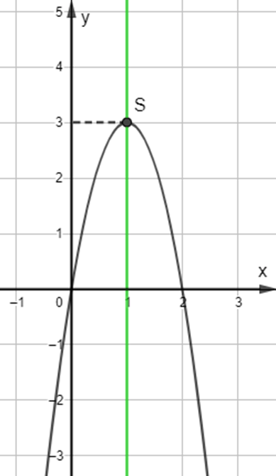 + Có đỉnh S với hoành độ: {x_S} = \frac{{ - b}}{{2a}} = \frac{{ - 6}}{{2.( - 3)}} = 1;{y_S} = - {3.1^2} + 6.1 = 3\({x_S} = \frac{{ - b}}{{2a}} = \frac{{ - 6}}{{2.( - 3)}} = 1;{y_S} = - {3.1^2} + 6.1 = 3\)