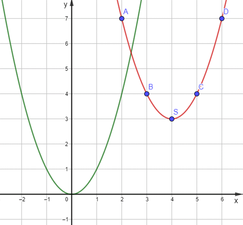 - Có trục đối xứng là đường thẳng x = 4 (đường thẳng này đi qua đỉnh S và song song với trục Oy).