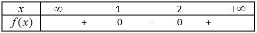 => Phương trình f\left( x \right) = 0\(f\left( x \right) = 0\) có 2 nghiệm phân biệt x = - 1,x = 2