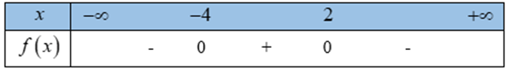 Tam thức bậc hai f\left( x \right) = - {x^2} - 2x + 8\(f\left( x \right) = - {x^2} - 2x + 8\) có hai nghiệm phân biệt {x_1} = - 4,{x_2} = 2\({x_1} = - 4,{x_2} = 2\) và hệ số a = - 1 < 0.