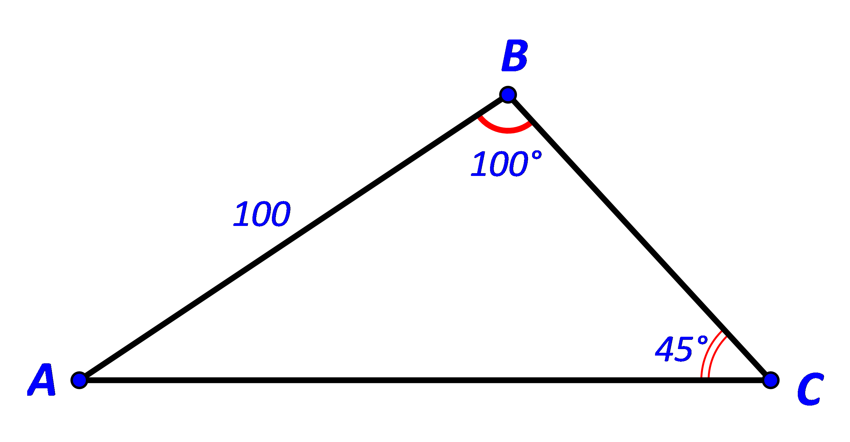 \(AB = 100,\widehat B = {100^o},\widehat C = {45^o}.\) Tính: