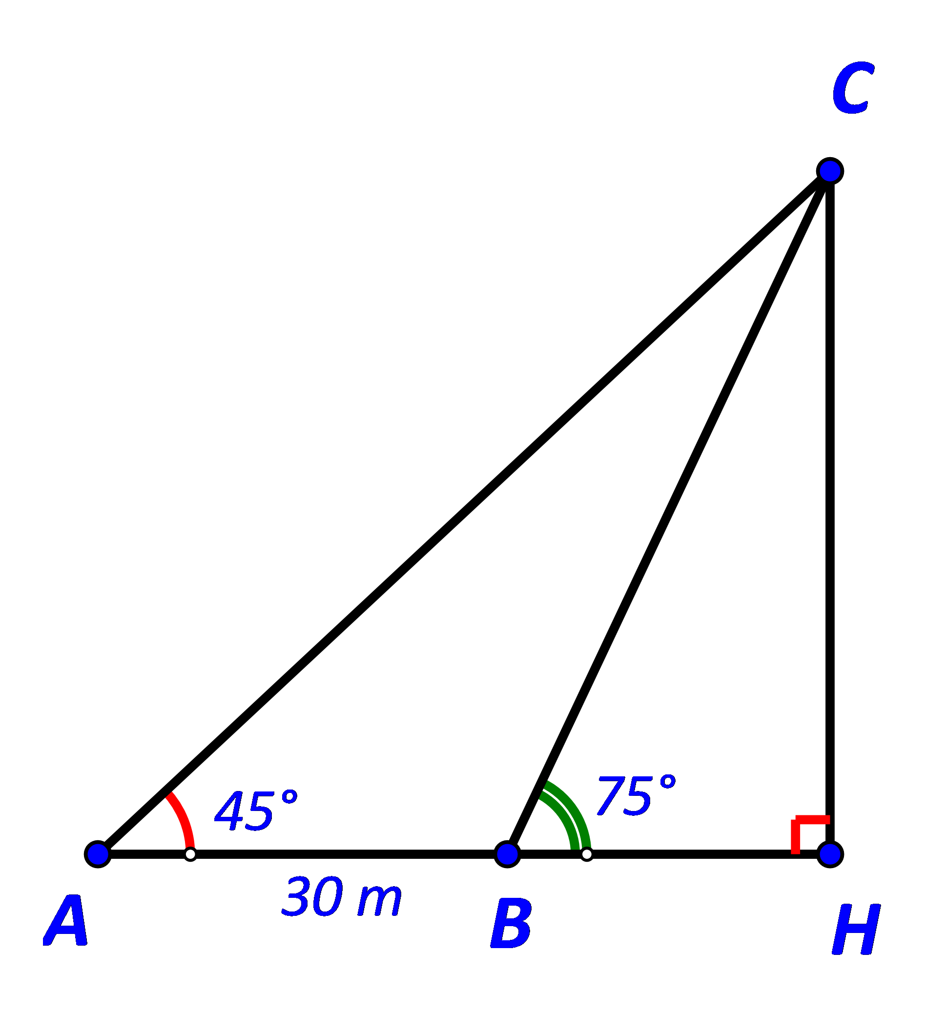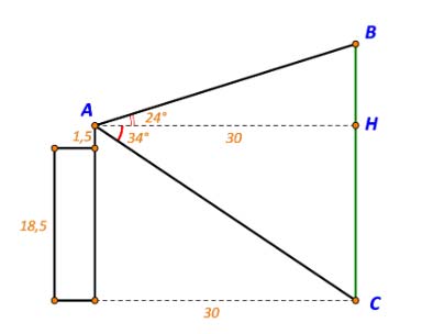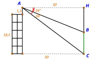 \(\tan {24^ \circ } = \frac{{BH}}{{AH}} \Rightarrow BH = 30.\tan {24^ \circ } \approx 13,357\)