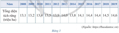 Bảng 3 cho biết tổng diện tích rừng từ năm 2008 đến năm 2019 ở nước ta.